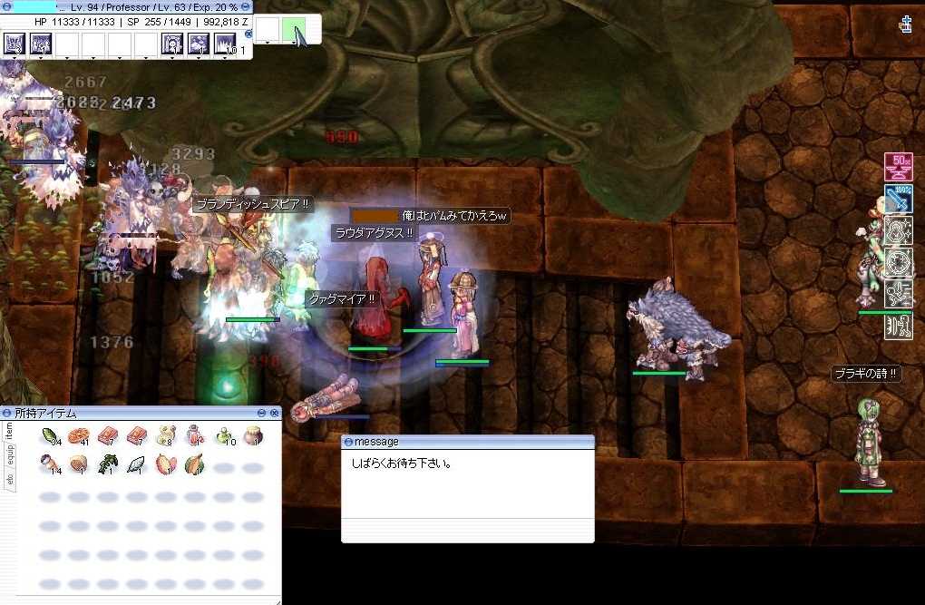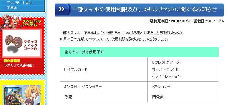 こんばんはヾ(*'∀')ノ 今日は愚痴ばっかで 読んだ人の気分を害するかもしれないので気をつけて読んでね。 私はまだ 支援メインのつもりですしこれからも支援メインです。 HPはベースもジョブもMAXでしたが転職したら また前の様に効率を求めることになることは分かってました。 Rがきたのが7月6日(火) 4日後の10日(土)にたまたまニコニコ動画でみたのと XRの9さんから言われてY-リさんと話して 日曜日にはRK志望の騎士を育ててました。 ギルド狩りでトールSPPをはじめたのが7月27日(火)。 Y-リさんに一緒に150目指そうぜと言われてABに転職して SPP役を増やす為と70台80台の友達のキャラをひきあげるため 私のキャラもひきあげるために99騎士を転生させました。 人も戻ってきたり新しい人も増えました。 公式からSPPだけじゃないけど他のスキルもおかしいね、 いつか修正するよって告知があったのが8月27日(金)。 http://www.ragnarokonline.jp/news/information/notice/improvements_plan2010.html それからは修正に怯えながらもすぐにはこないだろうと思ってました。 毎週メンテ後トールでカーサ一確して 安心するのが火曜日の習慣みたいになってました。 今日もそのはずでした。 タイミングよく9人目でログインして 木の陰に誰かいたと思ったらワイルドローズで早速しとめて グリフォンを倒し修正されてないことを確認して いざ狩りをはじめようとメランコリーを かけようとすると この場所では使用できないスキルです。 確かにメランコSPPは異常だったと思います。 でも何でメランコを一気に使えないようにするのかがわからないです。 メランコリーのフリー低下の部分が問題なら PTMにしかかからないようにすればいいし 使用禁止という糞にも劣る対応しか出来ないのなら それが異常と判明した時点で使用禁止にすればいいのに。 メランコSPPはこれくらいとして次はRGスキルですが スカラバガーデンがRDで簡単に攻略されたのも 集金団体には気に食わなかったのでしょうね。 公式にはこう書いてあるのに使用禁止(笑) 氏ねばいいのに。 いや氏ね。 8月からのカーサ一確、メンテ終了毎に確認してる日の中で ハロウィンで教範25効果がもらえる真ん中で 今日が一番来ないと思ってました。 そしてこれは私が勝手に思い込んでたことですが まずRDが修正されてからメランコ&SPPに修正が来ると思ってたので RDが修正されたらRGとABあげを必死になろう思ってたのです。 でもSPPは使い物にはならないOBさえ使えないロイヤルガードはただのおきもの。 これではどうしようもないですしブログもその時点で 一ヶ月以上溜まっておりそのままRO続けても 愚痴ったり愚痴られたりでいい雰囲気になると 思わなかったので事後報告でプチ休止しました。 突然で迷惑かけた人には申し訳ないです。 ブログ更新しながら少しだけは冷静になり 今回のパッチ(笑)でモチベ失った人は私だけでは ないと考えられるようになりました。 何よりペコ牧のギルド狩りそのものが 大損害を与えられたわけですしね。 私としてはここまでスキル使用禁止にしたら あの職のあのスキルも使用禁止にしろよっていうのが あるのですが公式ブログ(笑)書いてるやつがそのキャラもってるので しばらくは修正来なさそうですね。 またそれには11月いっぱいまで機器調整(笑)を 行うらしいのでまだまだ使用禁止のスキルが増えたり 色々守銭奴に有利な修正が来そうですね。 とりあえずは明日の様子を見ようと思います。 色々愚痴りましたけどRO内では愚痴りたくないからねヾ(*'∀')ノ ここまで汚い言葉で愚痴るとすっきりしたね。 まぁ一番すっきりしたのは 後日バッティングセンターでうちっぱなししたときだね。 復帰したらまずはギルドの現状把握とY-リさんと相方でいれるか どうかの確認からだねヾ(*'∀')ノ じゃこのブログはここまでだよ SEE YOU NEXT AGEINヾ(*'∀')ノ |